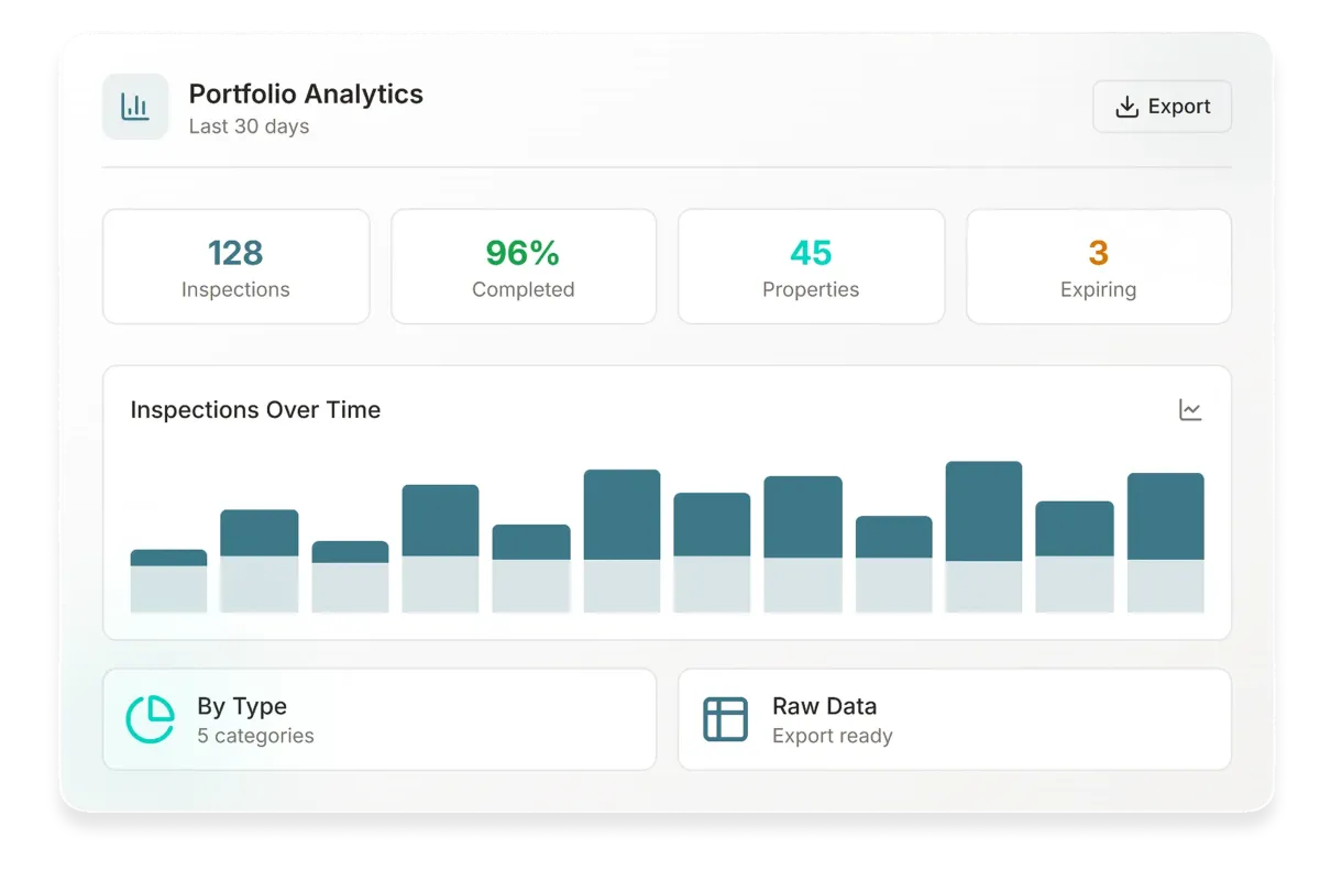 Real-time metrics on inspections, compliance, and portfolio performance at a glance.
